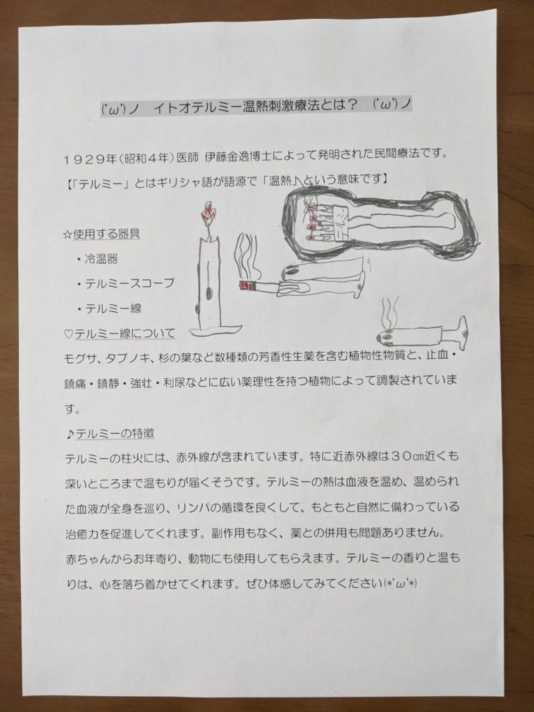 もうお一人の方はテルミー初体験。最近は腰痛に悩まされているとの事。全身テルミーをサッとかけた後、痛みの強い右腰から臀部、太腿裏にも多めに熱を入れました。テルミーの後は、顔色も良くなられ、心地よさを実感してくださり、気持ちよかった〜〇〇にもしてあげたい!と話してくださりました。